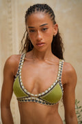Apportez une touche d'élégance à votre look estival avec ce haut de maillot en crochet kaki satiné. Confort et style assurés pour un été chic et raffiné.